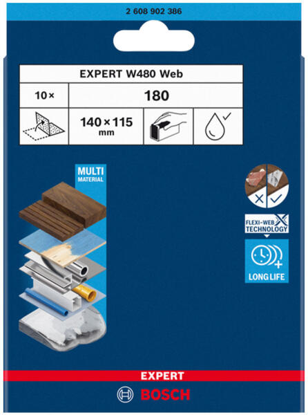 Bosch W480 kézi csiszolóháló, G180 10 db 115x140, G180 10 db mosható (2608902386)