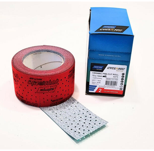 A Norton Cyclonic előre perforált tekercseit kifejezetten a legújabb Norton Cyclonic rendszerhez tervezték. Prémium No-fil A975 kerámia szemcsével készül, a tekercsek alkalmazásuk szerint színkóddal vannak ellátva a termék gyors és egyszerű kiválasztásához. A tekercsek kétféle méretben kaphatók (72 és 115 mm), tépőzáras hátlappal, hogy minden gyalupadhoz illeszkedjenek. A színes kivitel minden egyes alkalmazási lépést mutat a termék gyors és egyszerű kiválasztása érdekében, felgyorsítva a csiszolási folyamatot. A Norton Cyclonic egyedi lyukelrendezése és a lézervágás optimális porkivonást biztosít és akár 32% -kal növeli a termelékenységet a hagyományos több lyukú csiszoló termékekhez képest. Az önélező kerámia szemcsék kiváló csiszolási teljesítményt és hosszabb élettartamot biztosítanak, mint más szemcsék. A kerámia szemcsék hűvösebbé válnak és egyenletesebben kopnak, biztosítva a folyamatos eredményeket és egyértelműen egyenletes karcolásmintát. A No-Fil® formula megakadályozza az idő előtti eltömődést. Kék - durva felületű csiszolás (nagyolás) Zöld - durva csiszolás és gitt kiegyenlítése (csiszolás) Piros - befejező csiszolás (simítás) Lazac szín - alapozó csiszolása (polírozás)  Termék információk: Gyártói cikkszám:66261151793Méret:72mm x 12 mSzemcse típusa:KerámiaSzemcse:P220Specifikáci ó:A975Minimum rendelés: 4 dbvideo type="youtube" width="480" height="270" autoplay="0"https://www. youtube. com/watch?v=Y6PBh9VOSFQ&t/video
