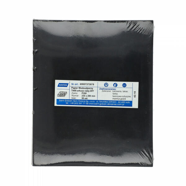 A Norton T44X vízálló csiszolópapír nagy teljesítményű szilíciumkarbid szemcsével nedves vagy száraz használatra alkalmas, nedves használat esetén tisztább felületet biztosít csiszolás közben. Gyors anyageltávolítás és simább és fényesebb felület elérése, ideális lakkozott felületeken való használatra és fémekhez. Festék- és lakkburkolatok, műanyagok, vas- és színesfémek csiszolására, polírozására is szolgál. Használható önmagában, csiszolótömbbel, kapcsos rögzítésű elektromos vagy akkumulátoros csiszológéppel.   Termék információk: Gyártói cikkszám: 69957373879Méret: 230x280 mmSzemcse típusa: Szilícium-karbidSzemcse: P280Specifikáció: T44XCsomagolási egység: 50 db/csomag video type="youtube" width="480" height="270" autoplay="0"https://www. youtube. com/watch?v=-a_BbHemcE0&t/video